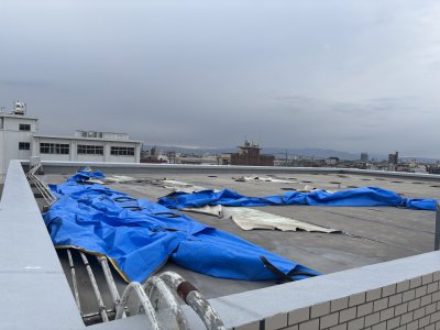 従来の防水層は有り雨漏りは発生していないが、塩ビシートが剥がれて